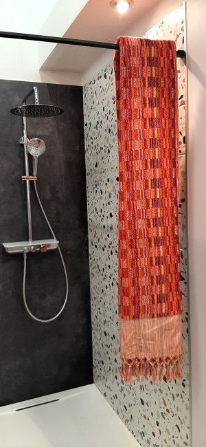 Fabriqué avec du fil de coton biologique, certifié GOTS, tissé à la main sur métier à navette, coloration à base de plantes.